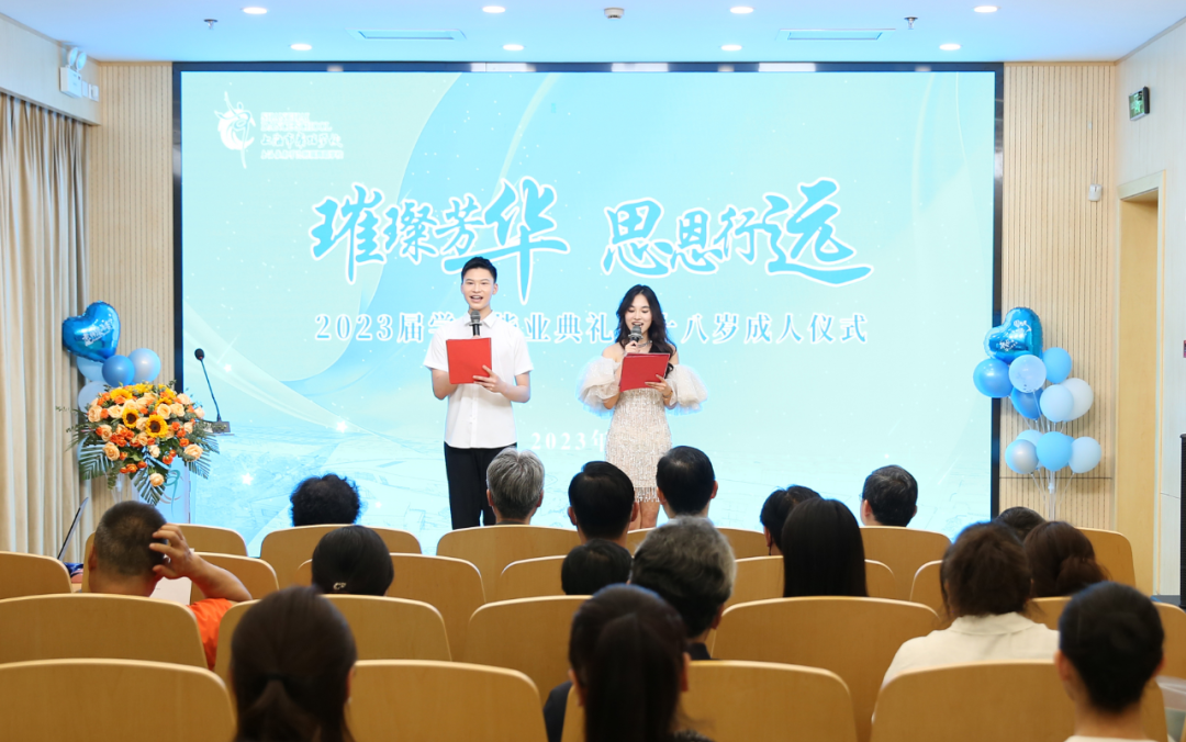 6月14日,伴随着音乐的律动,上海戏剧学院附属舞蹈学校2023届“璀璨芳华 思恩行远”毕业典礼暨十八岁成人仪式在4号楼报告厅拉开帷幕。上海戏剧学院附属舞蹈学校党总支书记、校长吴洁,党总支副书记康路,副校长乔晖、宁治,各科室领导、班主任、任课老师及家长代表齐聚现场,共同见证舞校2023届芭蕾舞、中国舞、歌舞专业90名学生毕业及成人的光荣时刻。