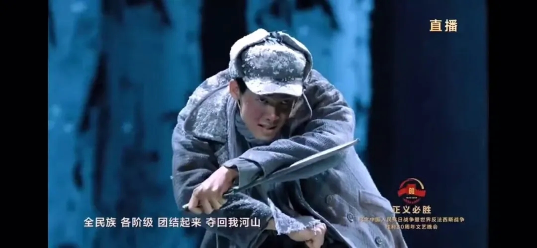 我在晚会第三篇章《遍地烽火》中担任《大刀舞》领舞。很荣幸能参与这样的重大演出,排练时我深刻体会到80 年前浴血奋战 14 年的战士中,许多人与我们年龄相仿,甚至还有更小的战士,他们用血肉之躯抵御外敌,才换来了今日的安逸生活。每次上台,我都仿佛置身杀声震天的战场,跳着跳着便热泪盈眶。